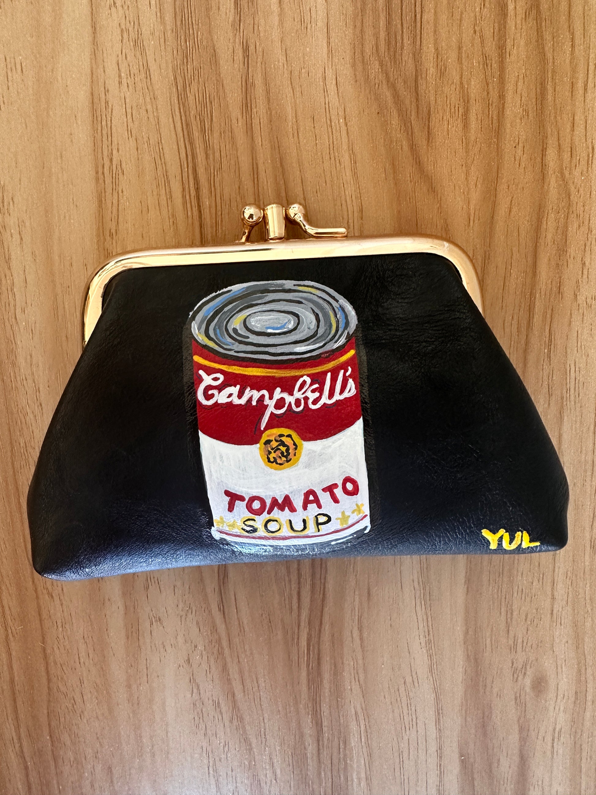 Black leather coin purse, Genuine Leather, hand painted Campbell's Soup on coin purse.